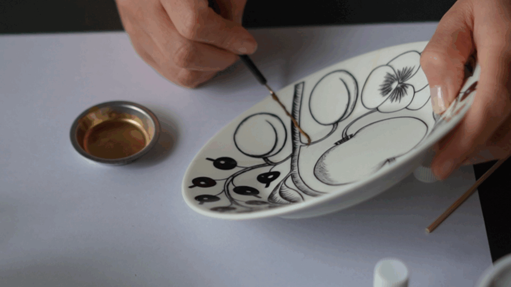 小さな筆で「割れ」や「欠け」の部分に塗っていきます。金色の線をゆっくりと書いていけば大丈夫。塗る面積が広い部分は少しぽってり盛り上がる感じで塗るのが私は好きです。